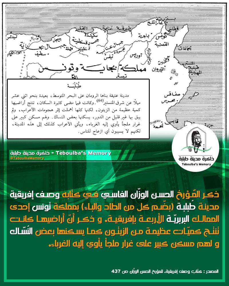 ذكر المٌؤرخ الحسن_الوزّان_الفاسي في كتابه وصف_إفريقية مدينة طُبلبة بمملكة تونس إحدى الممالك البربريّة الأربعة بإفريقية. و ذكر أنّ أراضيها كانت تنتج كميّات عظيمة من الزيتون كما يسكنها بعض النُسّاك و لهم مسكن كبير على غرار ملجأ يأوي إليه الغرباء. كما ذكر من مدن الساحل سوسةالمنستير و المهدية. المصدر : كتاب وصف إفريقية. للمؤرح الحسن الوزّان ص 437