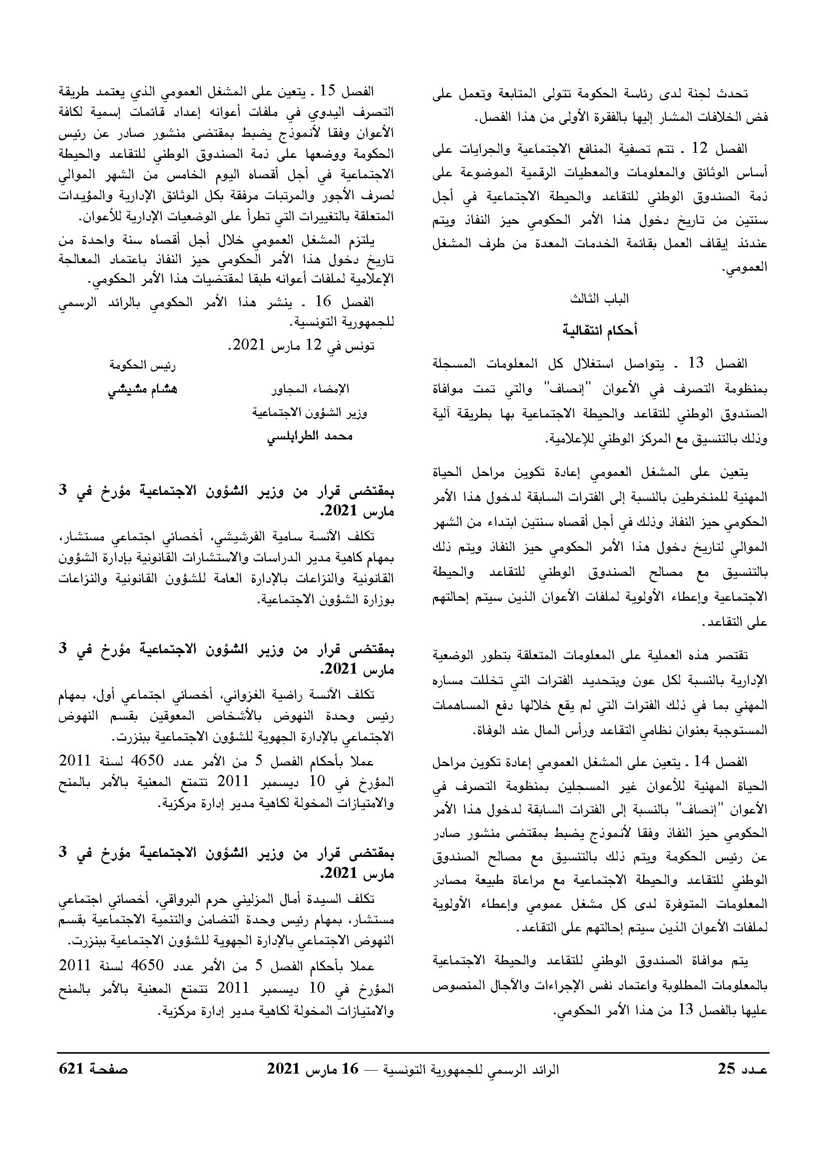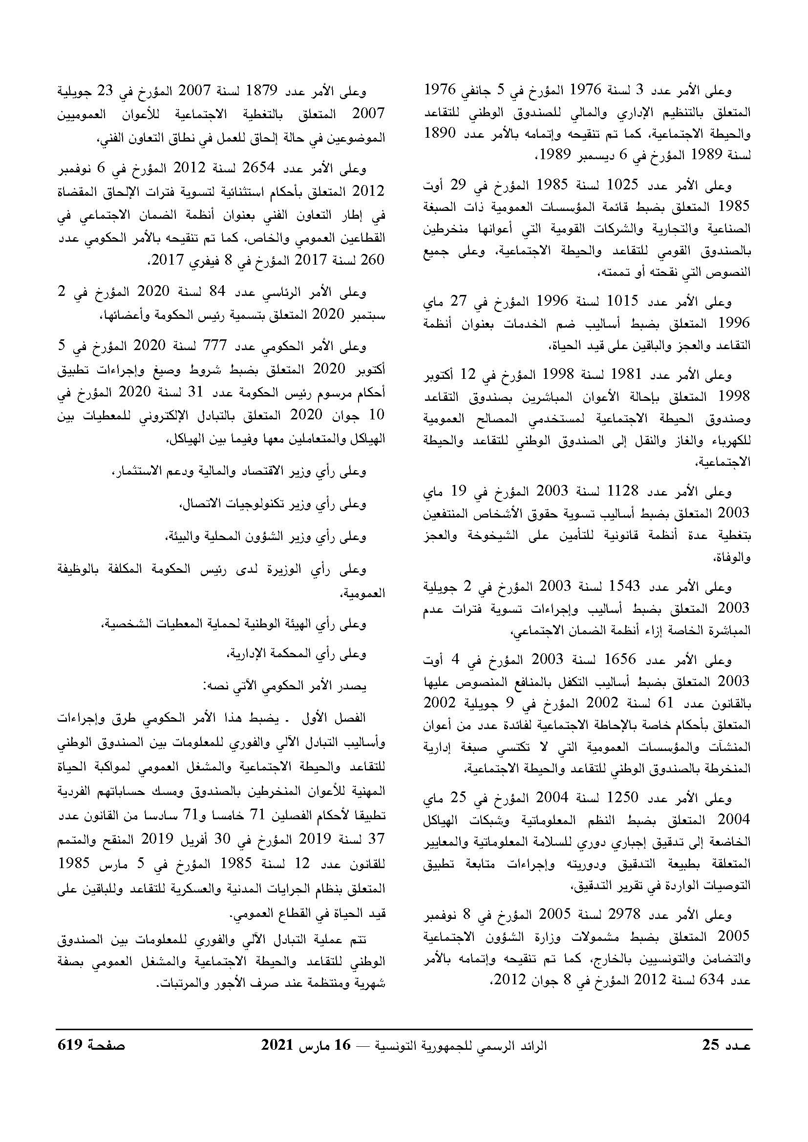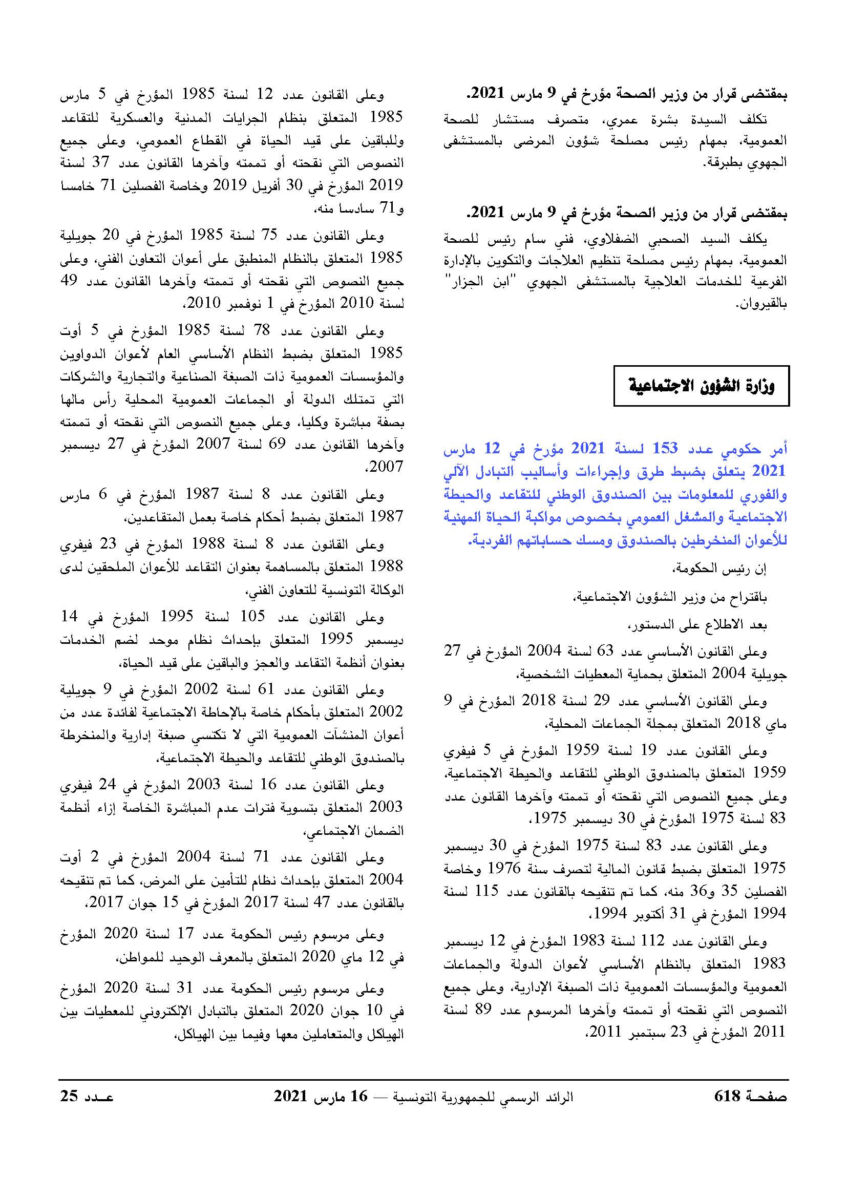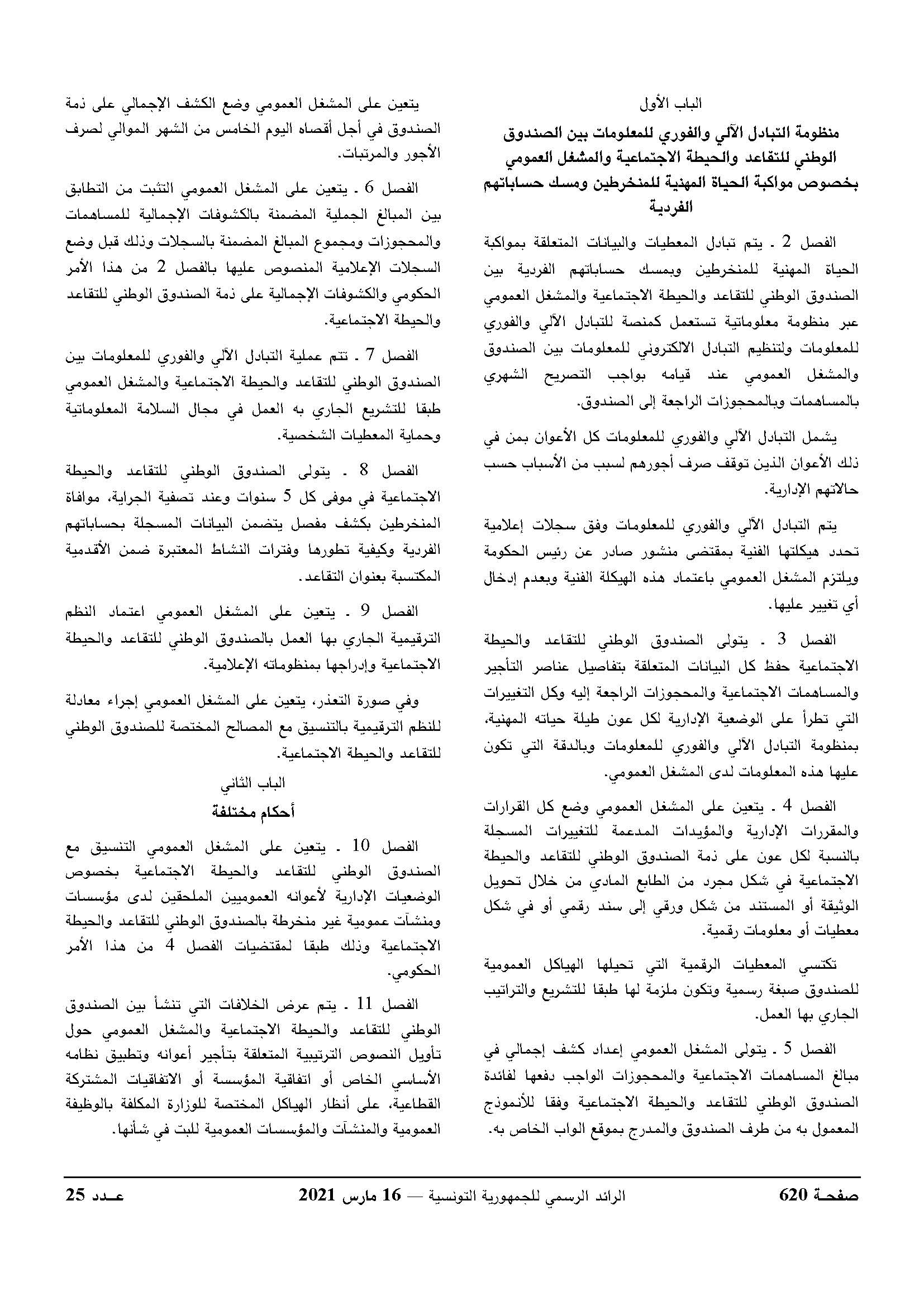 أمر حكومي عـدد 153 لـسنة 2021 مؤرخ في 12 مارس 2021 يتعلق بضبط طرق وإجراءات وأساليب التبادل الآلي والفوري للمعلومات بين الصندوق الوطني للتقاعد والحيطة الاجتماعية والمشغل العمومي بخصوص مواكبة الحياة المهنية للأعوان المنخرطين بالصندوق ومسك حساباتهم الفردية.