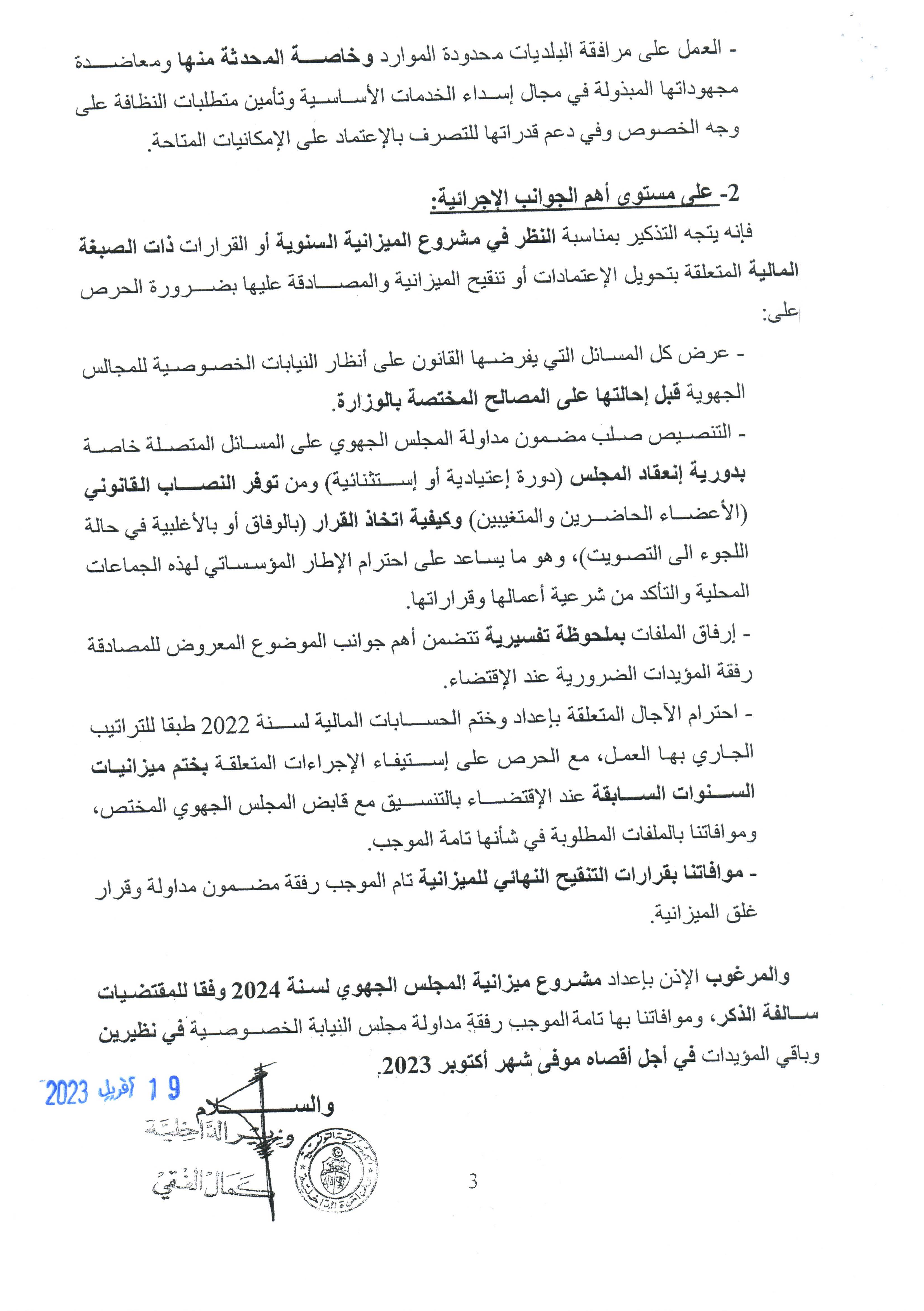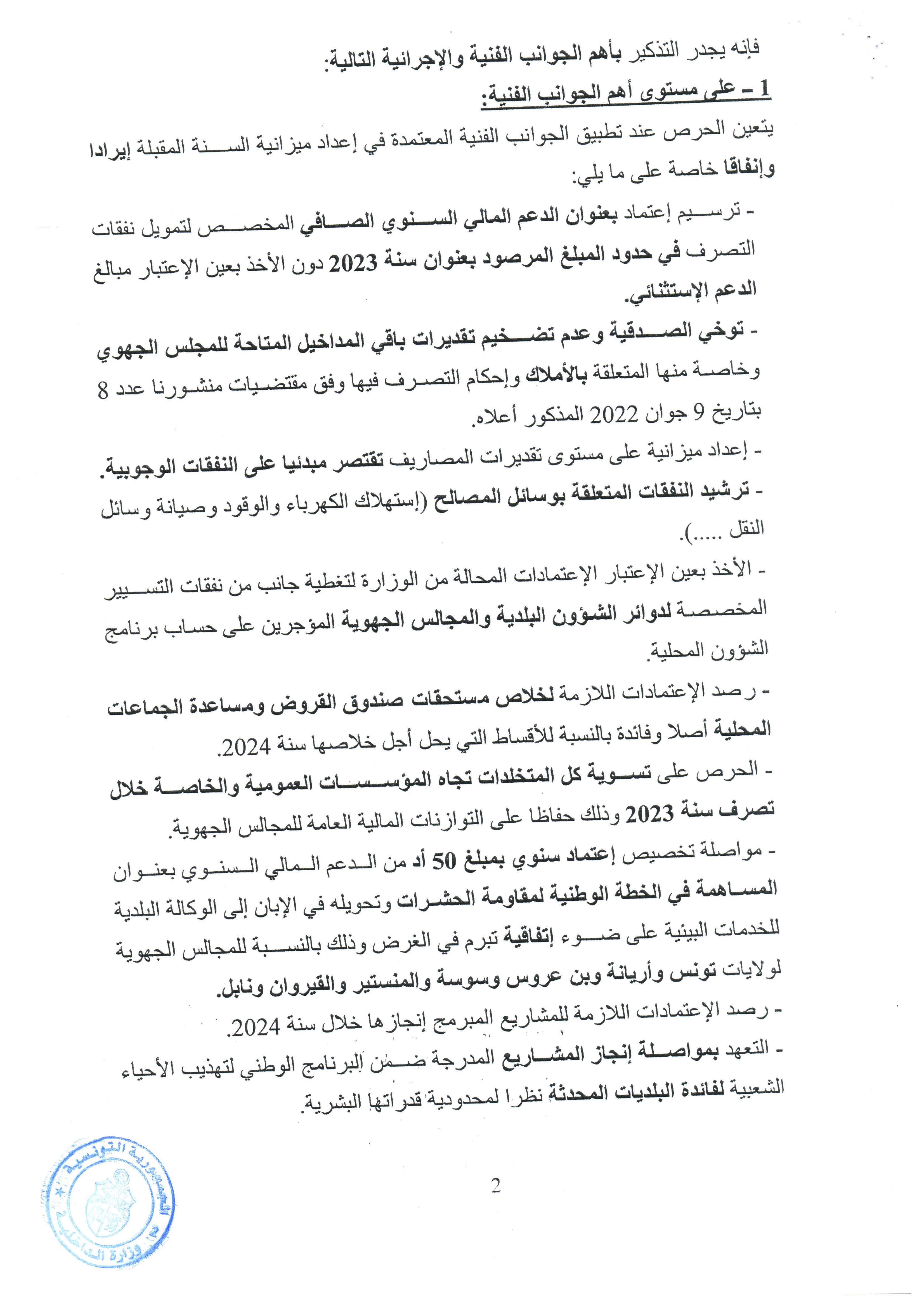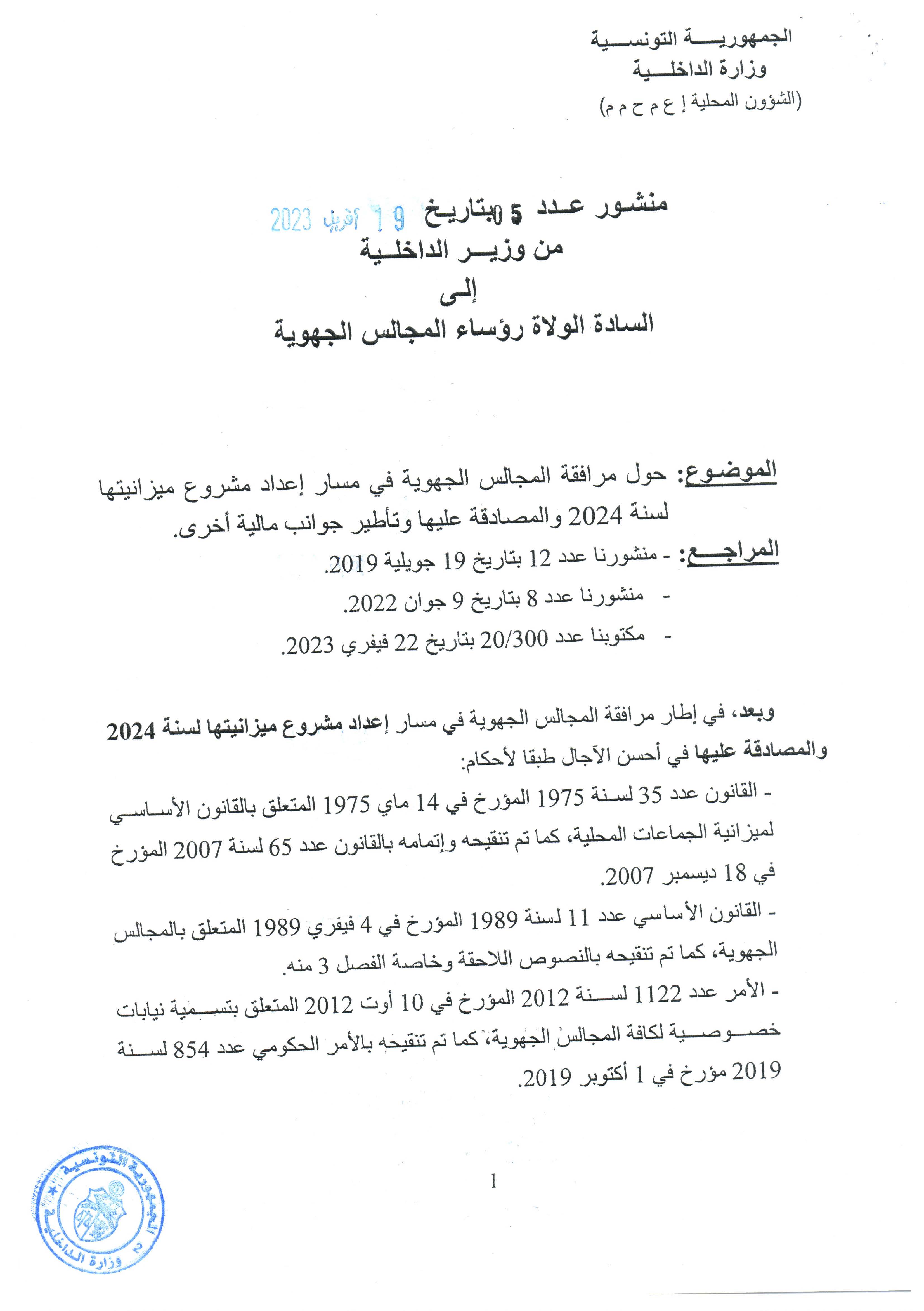 منشور عدد 5 لسنة 2023 المؤرخ في 19 أفريل 2023 المتعلق بمرافقة المجالس الجهوية في مسار إعداد مشروع ميزانتها لسنة 2024
