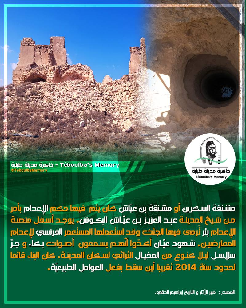 كان يتم فيها حكم #الإعدام بأمر من شيخ المدينة عبد العزيز بن عيّاش #البكوش. يوجد أسفل منصة الإعدام #بئر تُرمى فيها الجثث وقد استعملها المستعمر الفرنسي لإعدام المعارضين. شهود عيّان أكدّوا أنّهم يسمعون أصوات #بكاء و جرّ سلاسل ليلا كنوع من #المخيال التراثي لسكان المدينة. كان البناء قائما لحدود سنة 2014 تقريبا أين سقط بفعل العوامل الطبيعيّة.